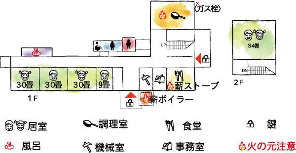 ![]() 食堂でわいわい 元職員室を現在は食堂として使用しています。薪ストーブが設置され、冬でも快適な食事が楽しめます。 |